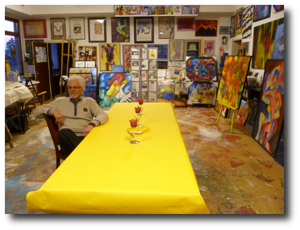 Franz Kruse, weit über die Stadtgrenzen hinaus bekannter Künstler, hatte seine Ateliertüren geöffnet und zu einer Besichtigung eingeladen. Sehr interessiert betraten wir die Räume. Sofort fällt einem die besondere Atmosphäre auf, die von dort ausgeht. Unzählige Bilder, von kleinen Zeichnungen bis zu großen Wandgemälden und Skulpturen, sind zu sehen.Zu jedem Kunstwerk kann Herr Kruse eine Geschichte erzählen, und die Art und Weise, wie er das tut, lässt einen gebannt zuhören.